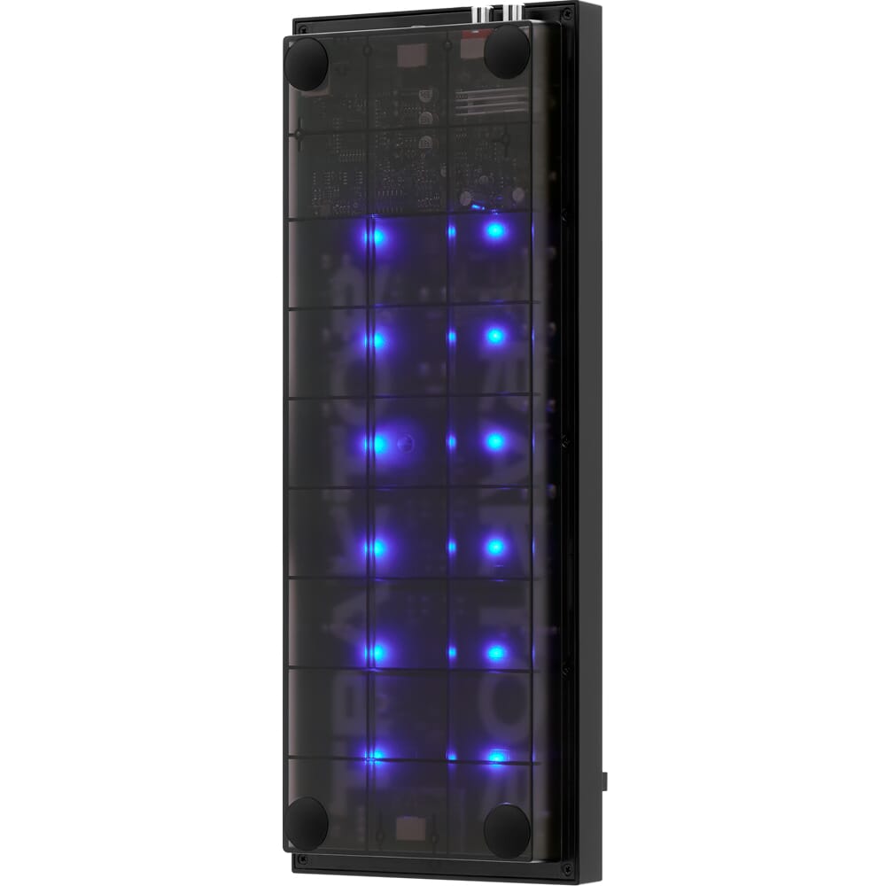 • A sleek black design with a transparent bottom shell housing the functional backlighting